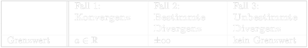 Sie können das Grenzwertverhalten (Konvergenz, bestimmte oder unbestimmte Divergenz) von 𝑎𝑛 mit 𝑛⟶∞ begründen.